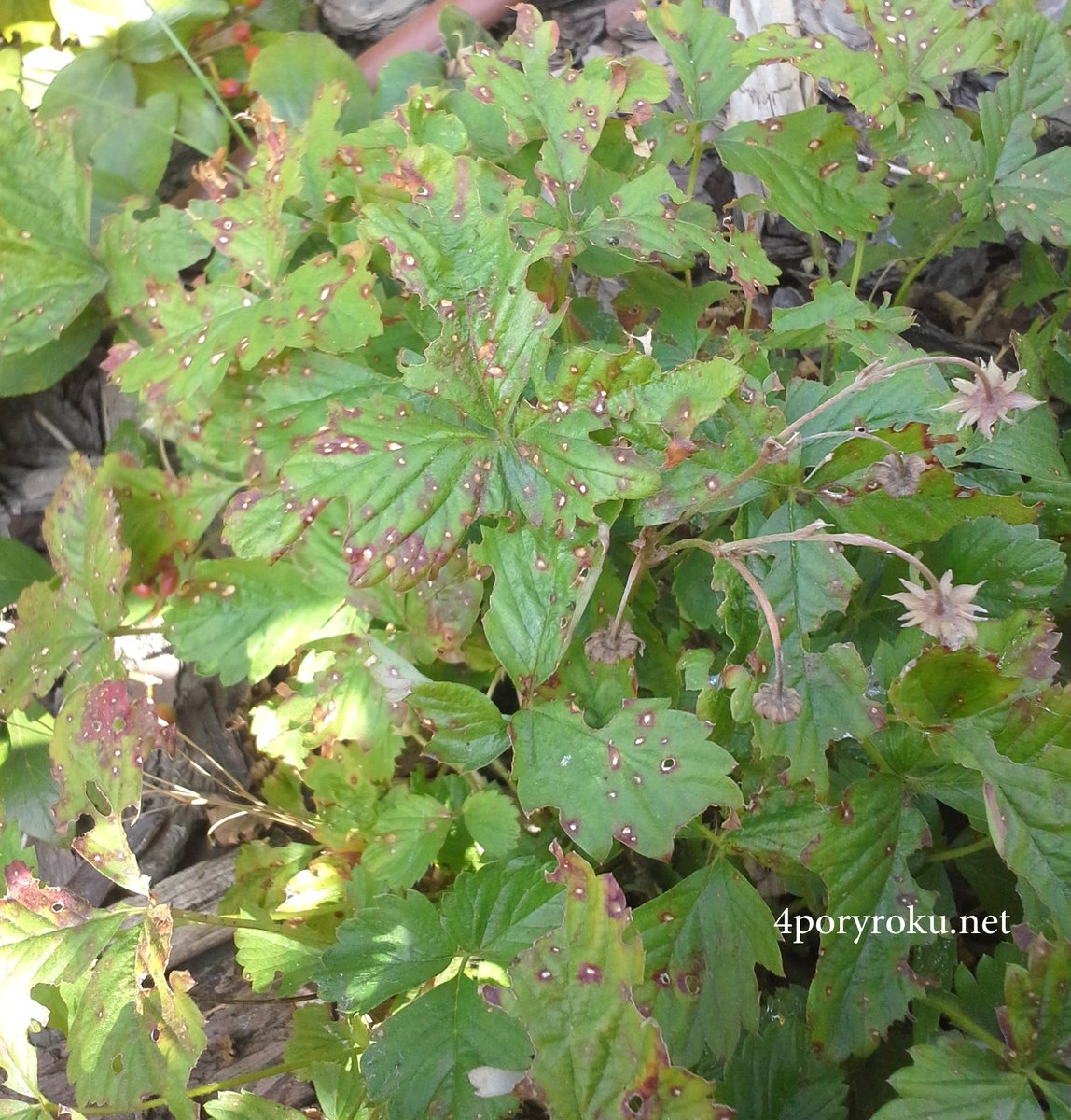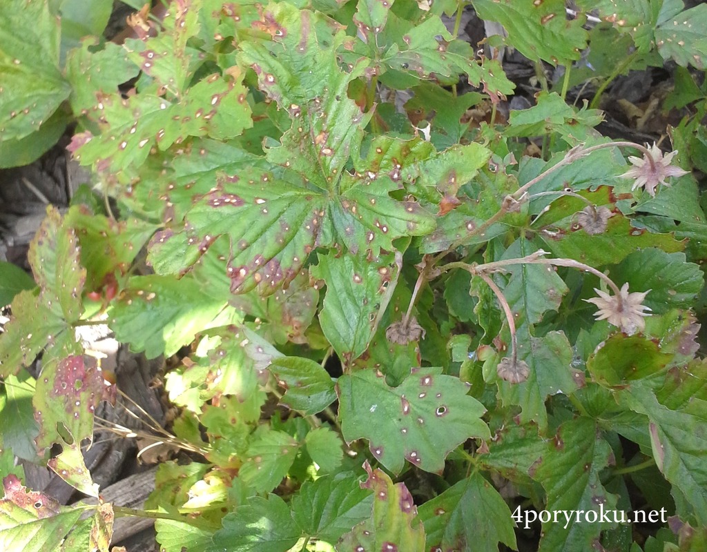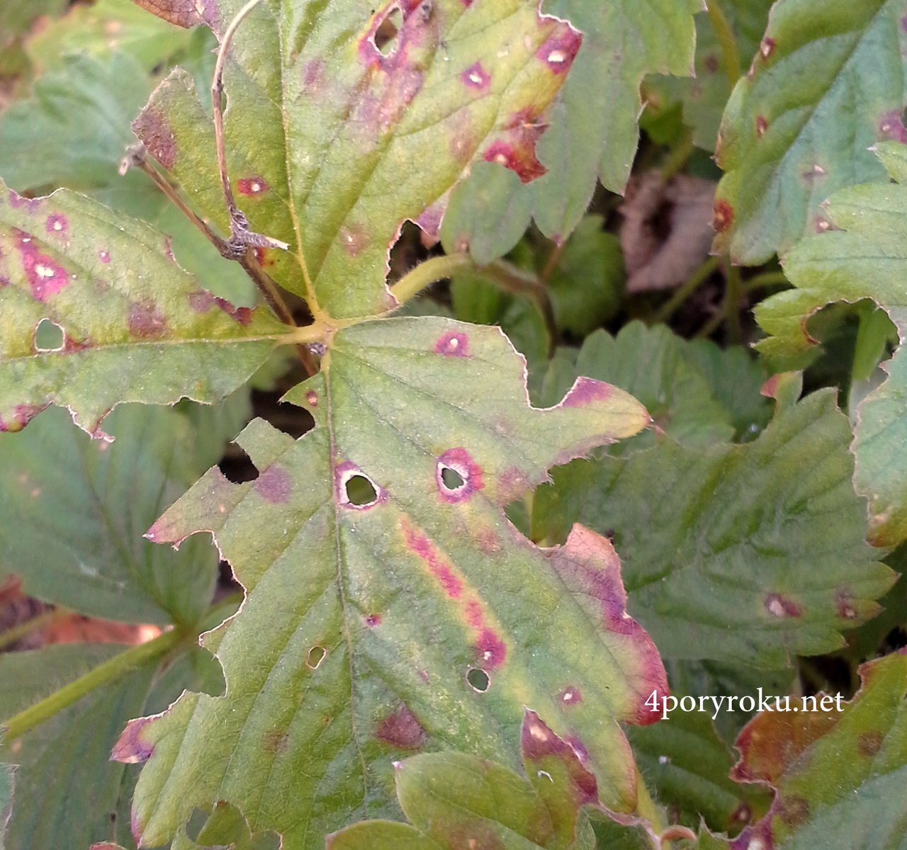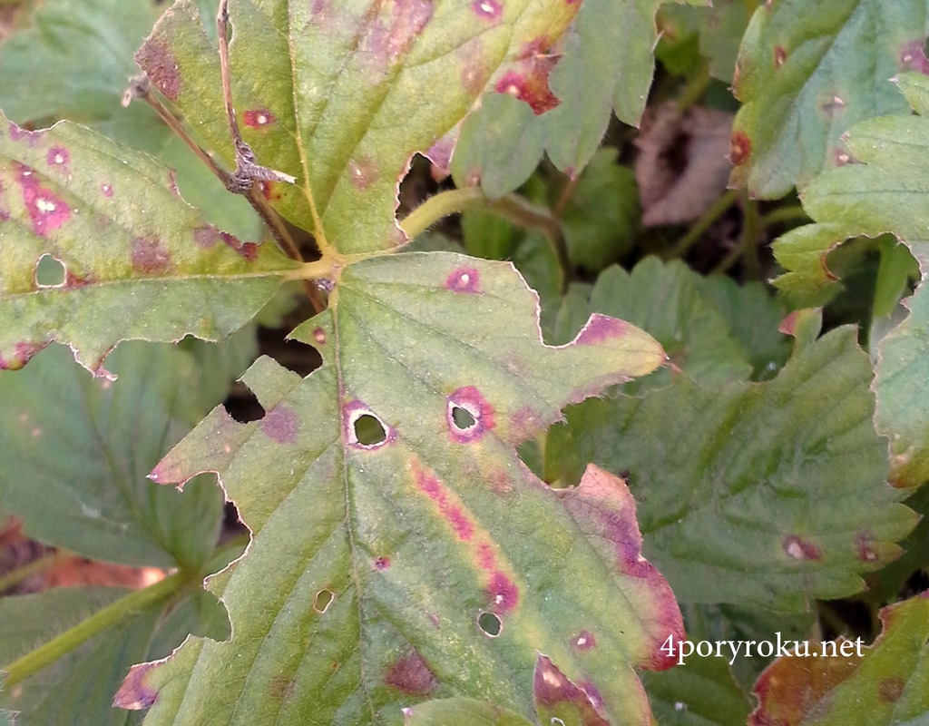 Objawy występują na liściach, szypułkach owoców, rozłogach oraz w skrajnych przypadkach na płatkach kwiatów. Grzyb jest widoczny w postaci szarobiałych plamek z czerwonobrunatnym obrzeżem.