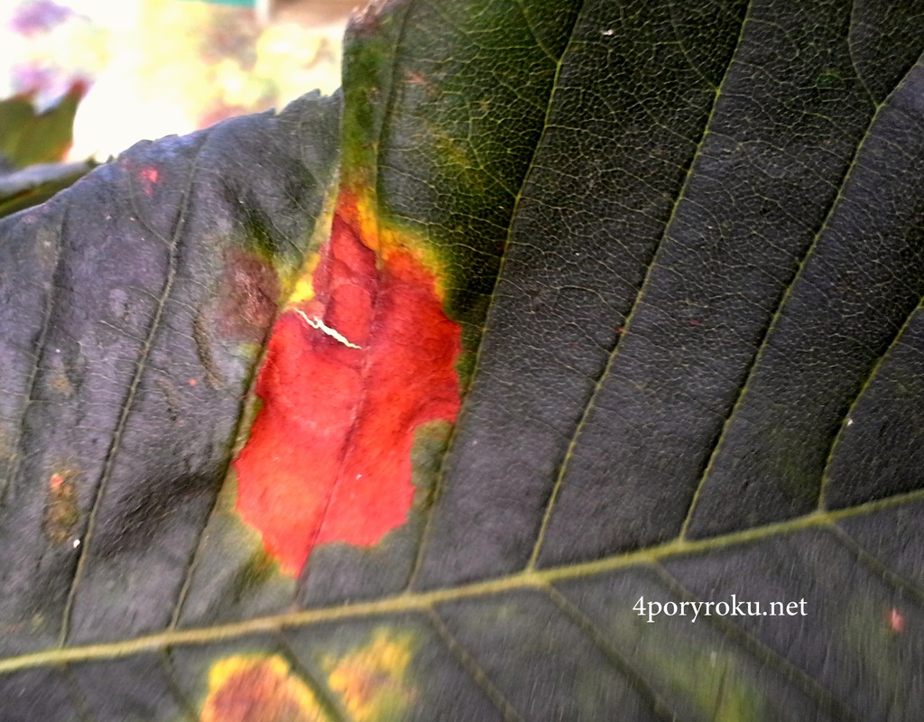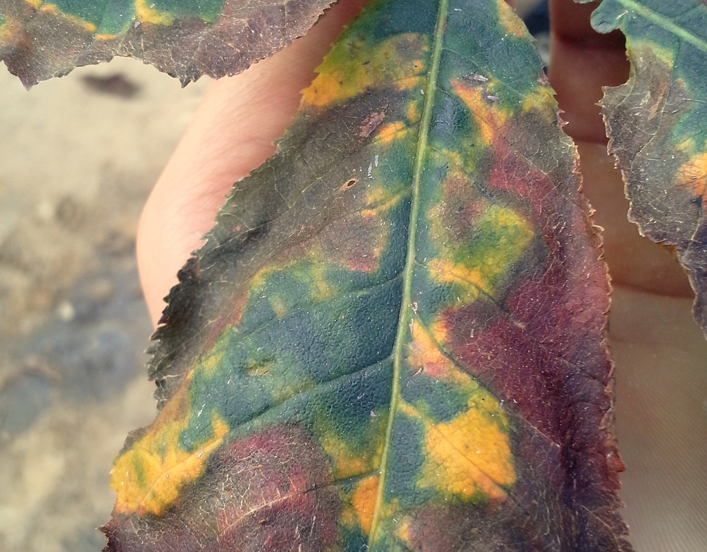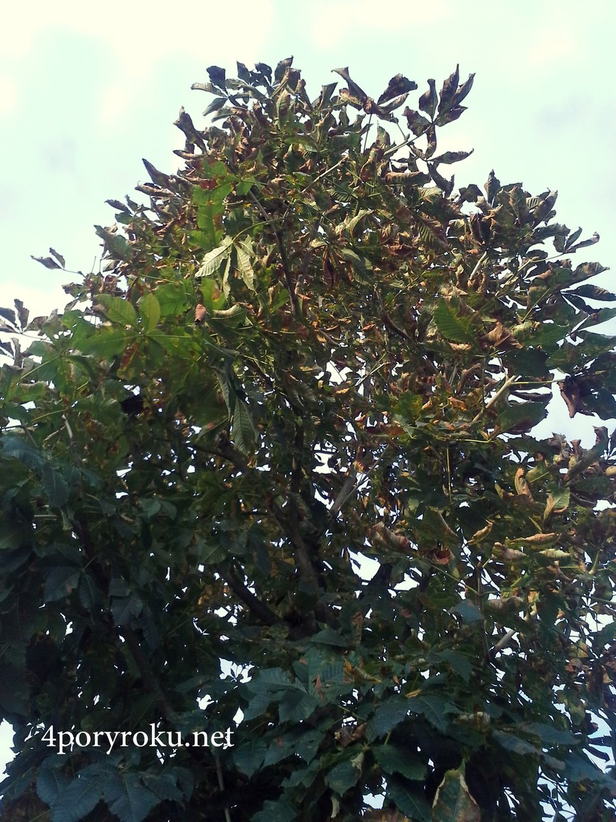 Liście kasztanowca czerwonego oprócz plam, zwijają się na brzegach w górę i przedwcześnie opadają.
