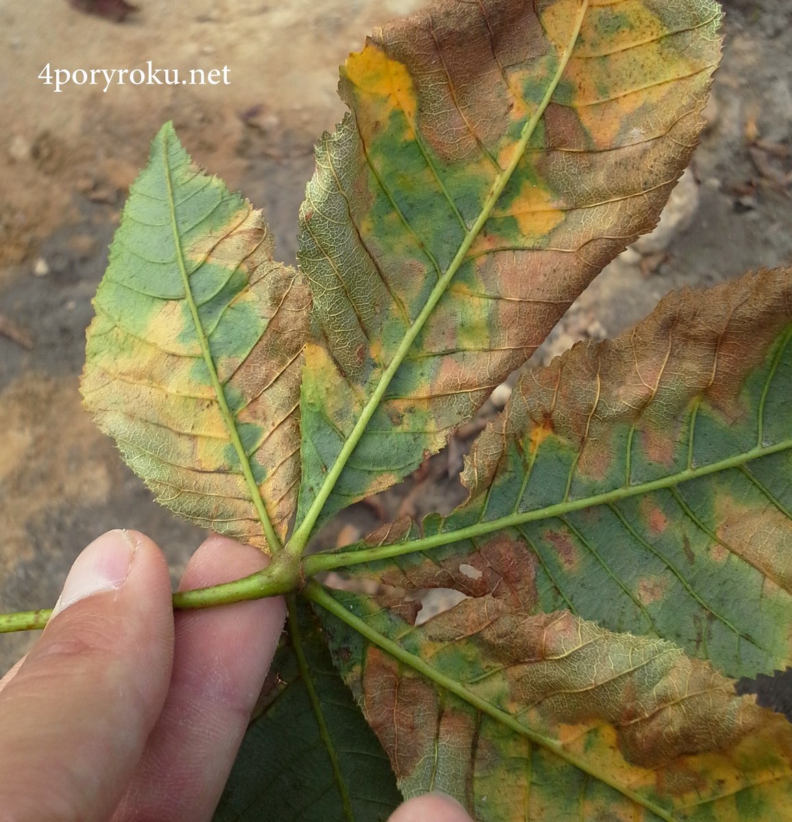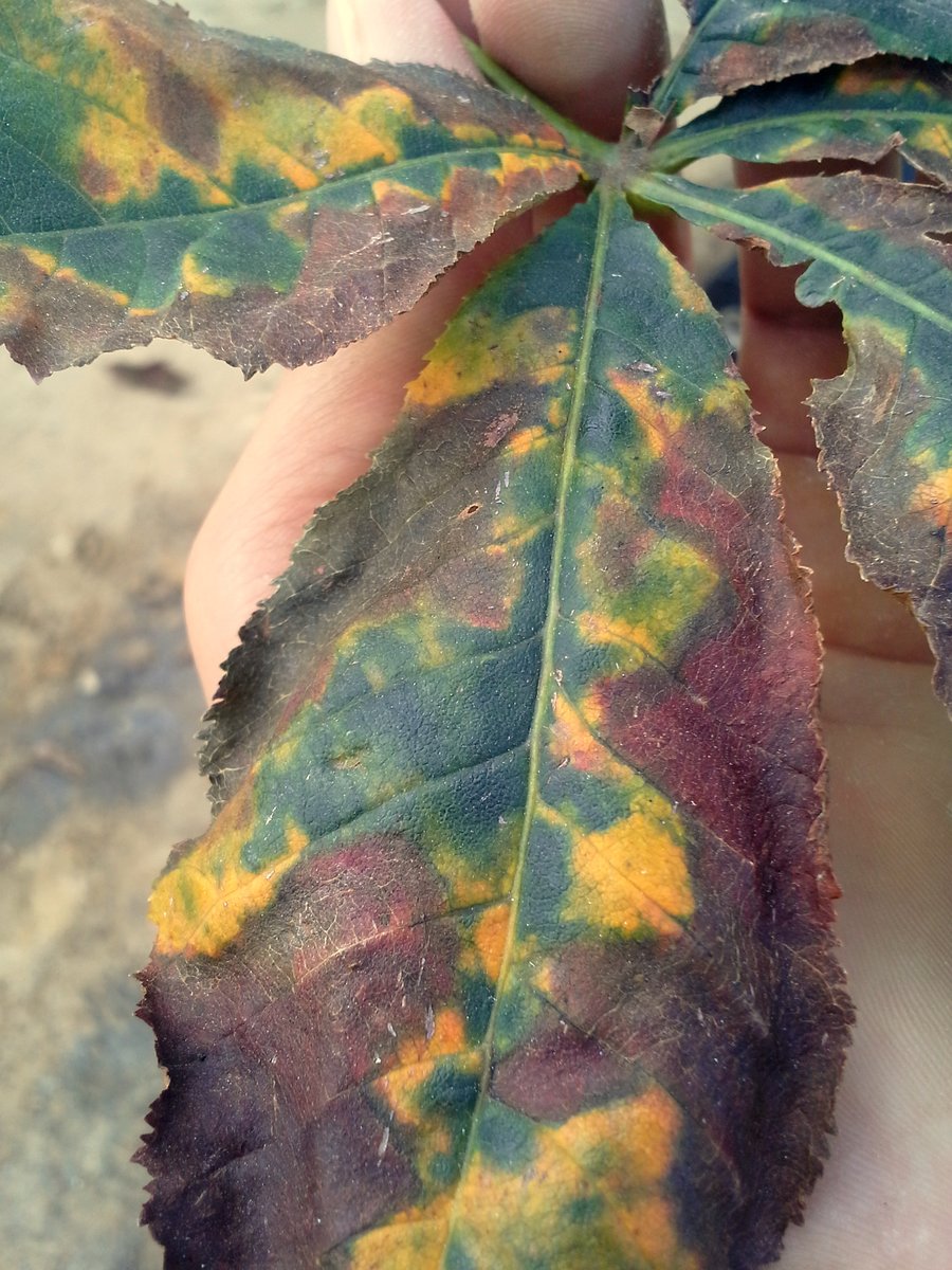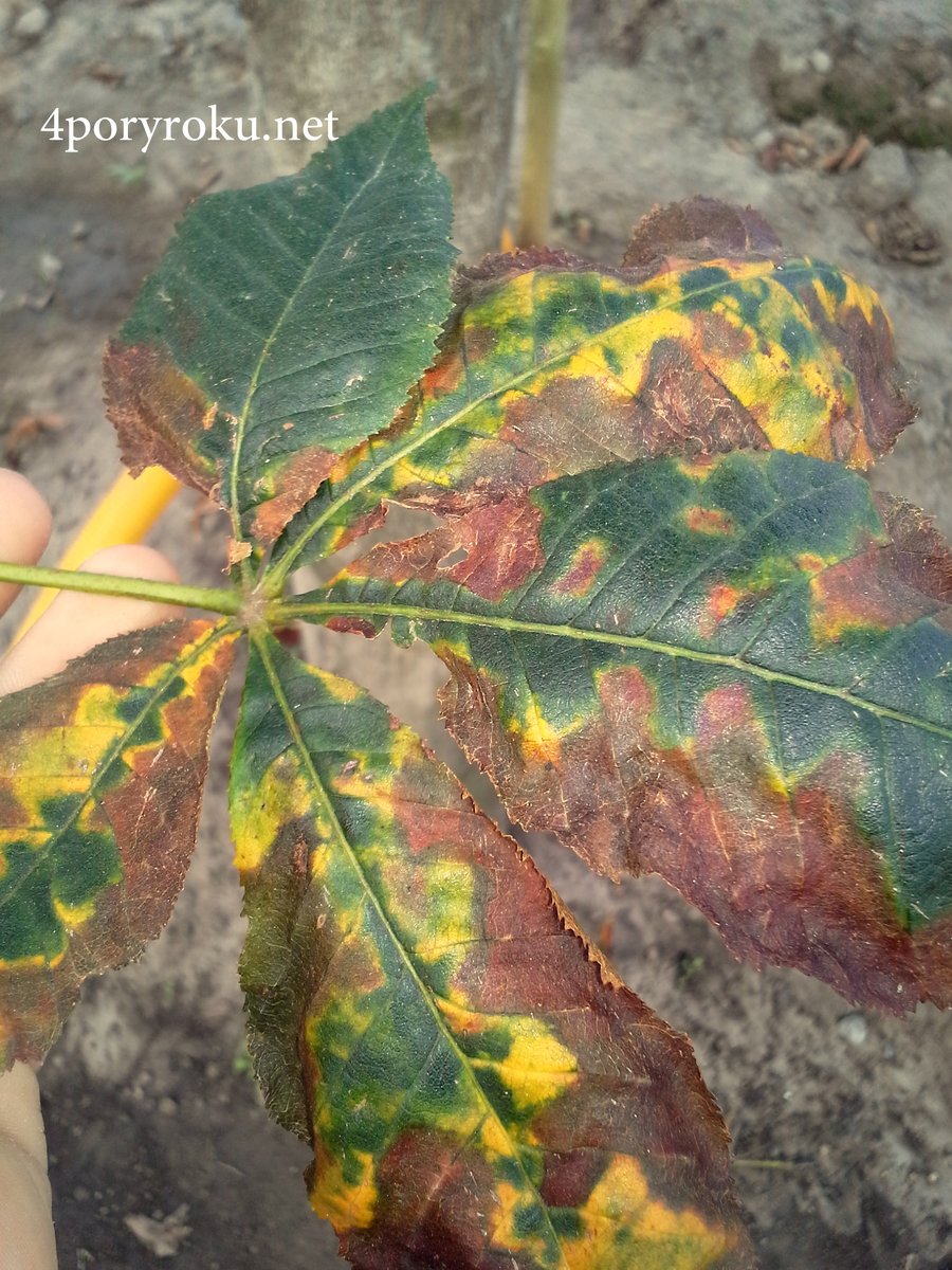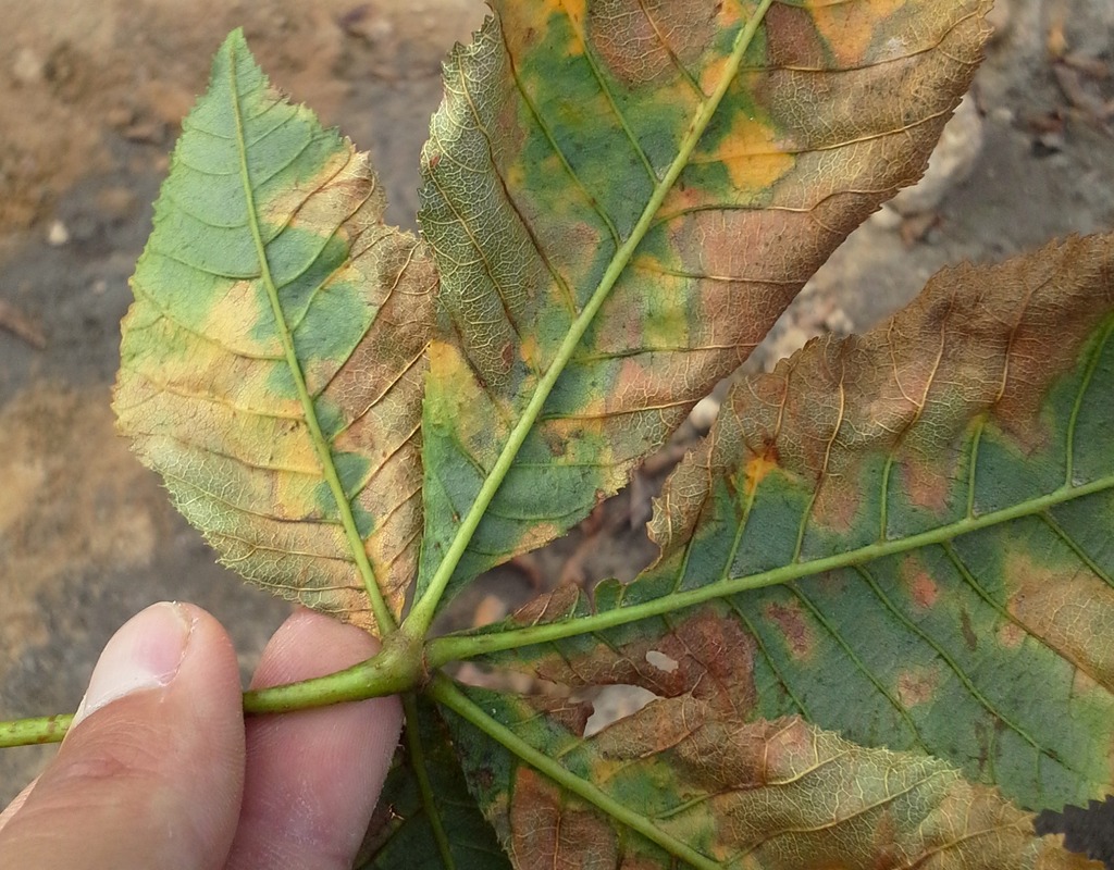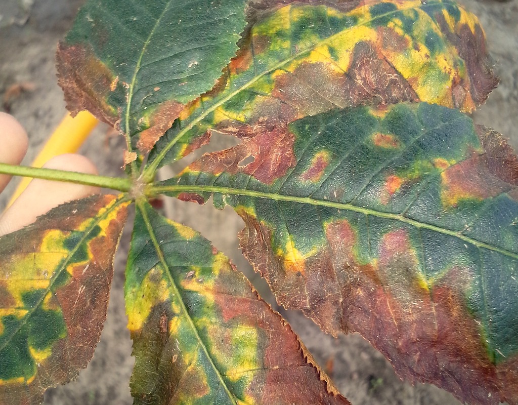 Na liściach kasztanowca czerwonego od lipca do sierpnia, mogą się pojawiać brunatne plamy z żółtą obwódką. Choroba przypomina objawy żerowania szrotówka kasztanowcowiaczka, lecz przy bliższym przyjrzeniu się nekrozą, nie odnajdziemy tam larw owada.